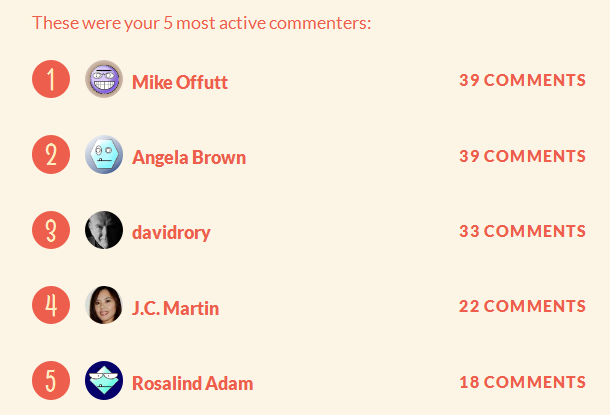 Many thanks to everyone who commented in 2012, and especially to Mike Offutt, Angela Brown, David Rory, J.C.Martin and Rosalind Adam.