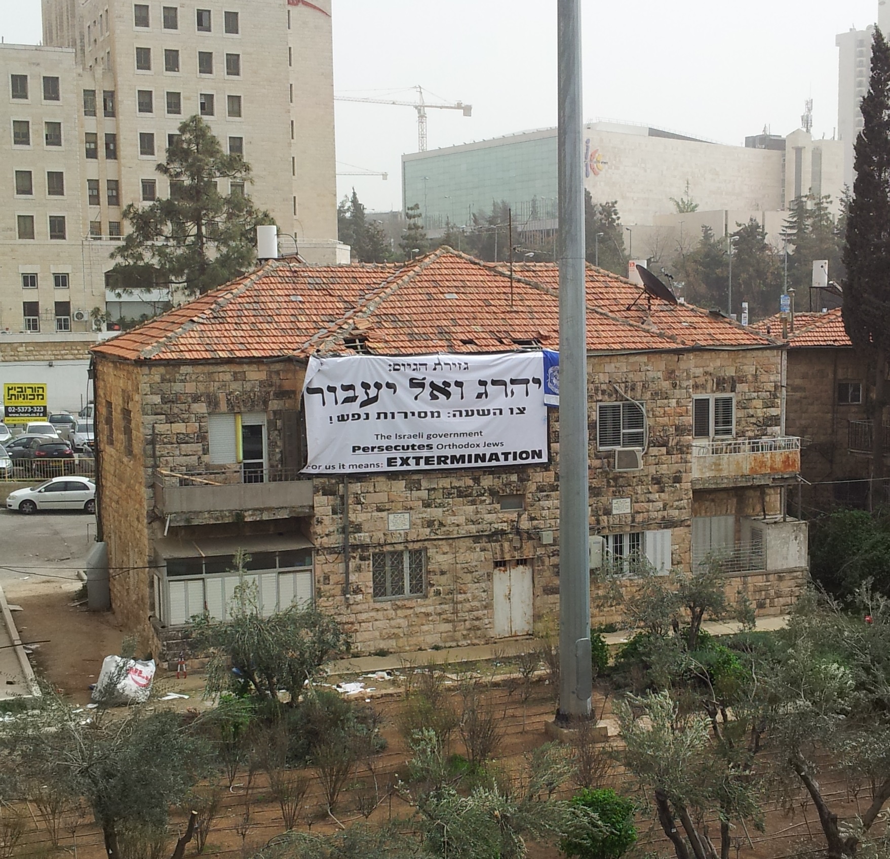 But that’s what the sign said. I read it. I needed to walk along the String Bridge on my way from one errand to the next, this morning. I looked down at the area where yesterday a sea of black hats swayed in prayer and demonstration and there it was: EXTERMINATION.
